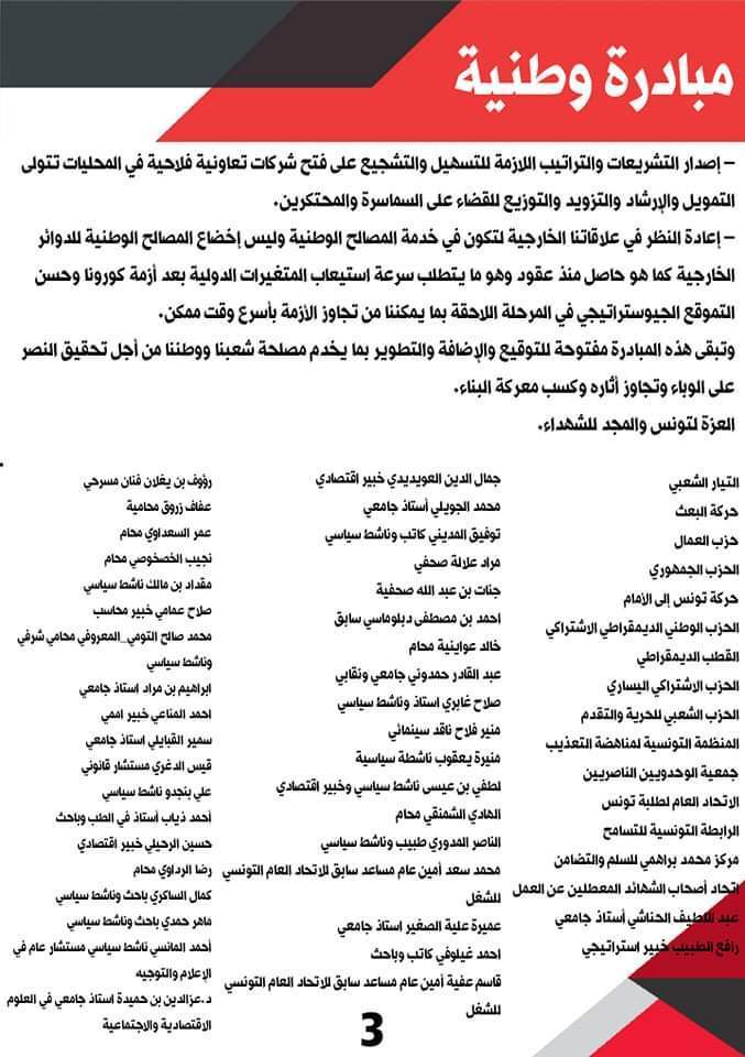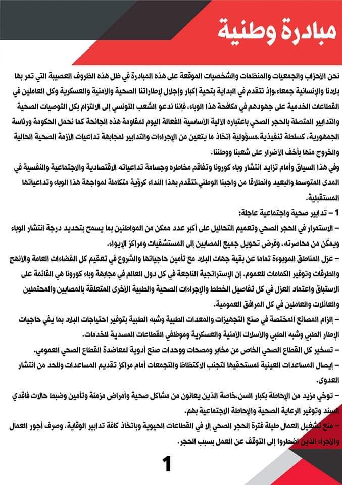 نحن الأحزاب والجمعيات والمنظمات والشخصيات الموقعة على هذه المبادرة في ظل هذه الظروف العصيبة التي تمر بها بلادنا والإنسانية جمعاء،وإذ نتقدم في البداية بتحية إكبار وإجلال لإطاراتنا الصحية والأمنية والعسكرية وكل العاملين في القطاعات الخدمية على جهودهم في مكافحة هذا الوباء، فإننا ندعو الشعب التونسي إلى الالتزام بكل التوصيات الصحية والتدابير المتصلة بالحجر الصحي باعتباره الآلية الأساسية الفعالة اليوم لمقاومة هذه الجائحة كما نحمل الحكومة ورئاسة الجمهورية، كسلطة تنفيذية،مسؤولية اتخاذ ما يتعين من الإجراءات والتدابير لمجابهة تداعيات الأزمة الصحية الحالية والخروج منها بأخف الأضرار على شعبنا ووطننا.