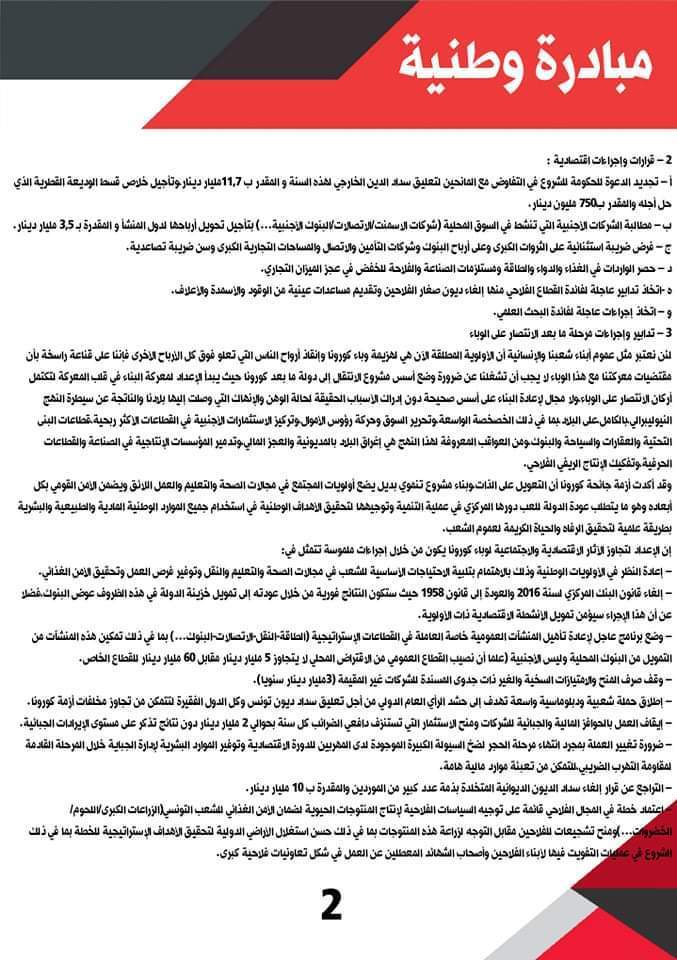 – إطلاق حملة شعبية ودبلوماسية واسعة تهدف إلى حشد الرأي العام الدولي من أجل تعليق سداد ديون تونس وكل الدول الفقيرة لتتمكن من تجاوز مخلفات أزمة كورونا.